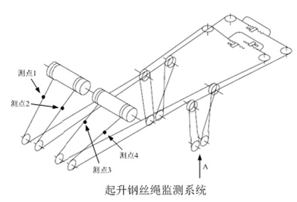 作為岸橋起重機結構重要的起升機構,其鋼絲繩系統共布置了4個測點,示意圖如下: