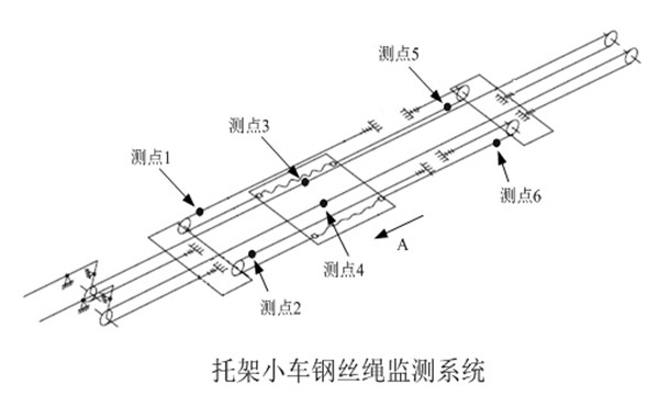 牽引小車鋼絲繩系統共布置了4個測點,示意圖如下: