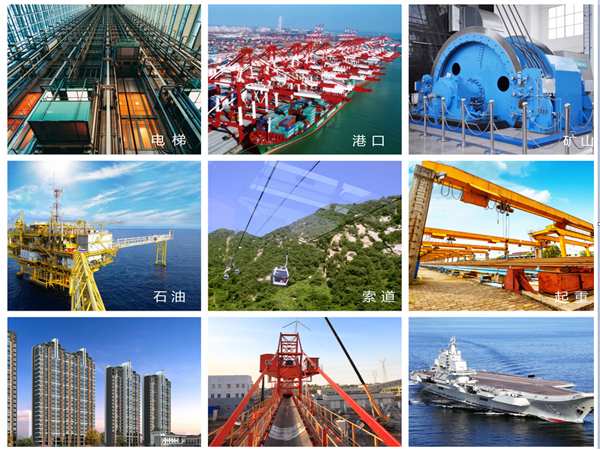 產品廣泛應用于電梯、礦山、港口、石油、索道、電力、冶金、起重機械、船舶、工業、斜拉橋及軍事等領域。在國內市場具有高份額的市場占有率,在國際市場遠銷多個國家。
