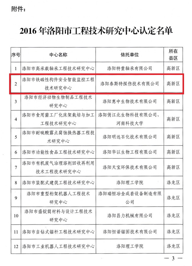 根據《洛陽市工程技術研究中心管理辦法》(洛市科【2006】95號)規定,經組織申報、初審、現場考察、會議評審等評審程序,洛陽泰斯探傷技術有限公司被認定為洛陽市鐵磁性構件安智能監控工程技術研究中心。